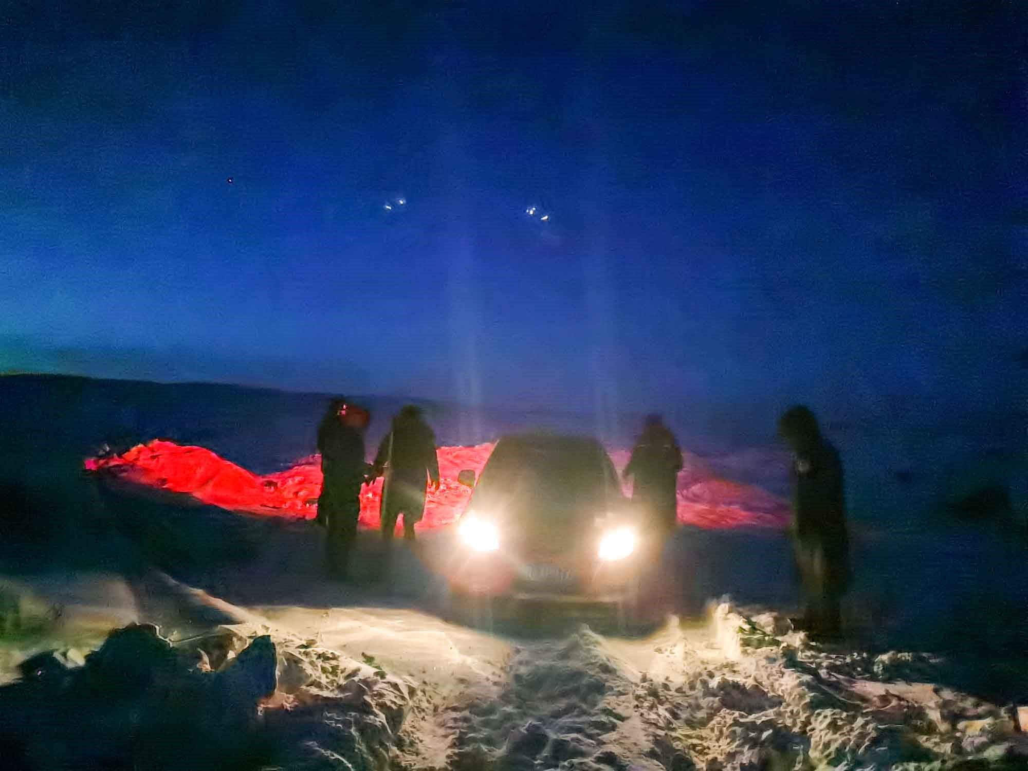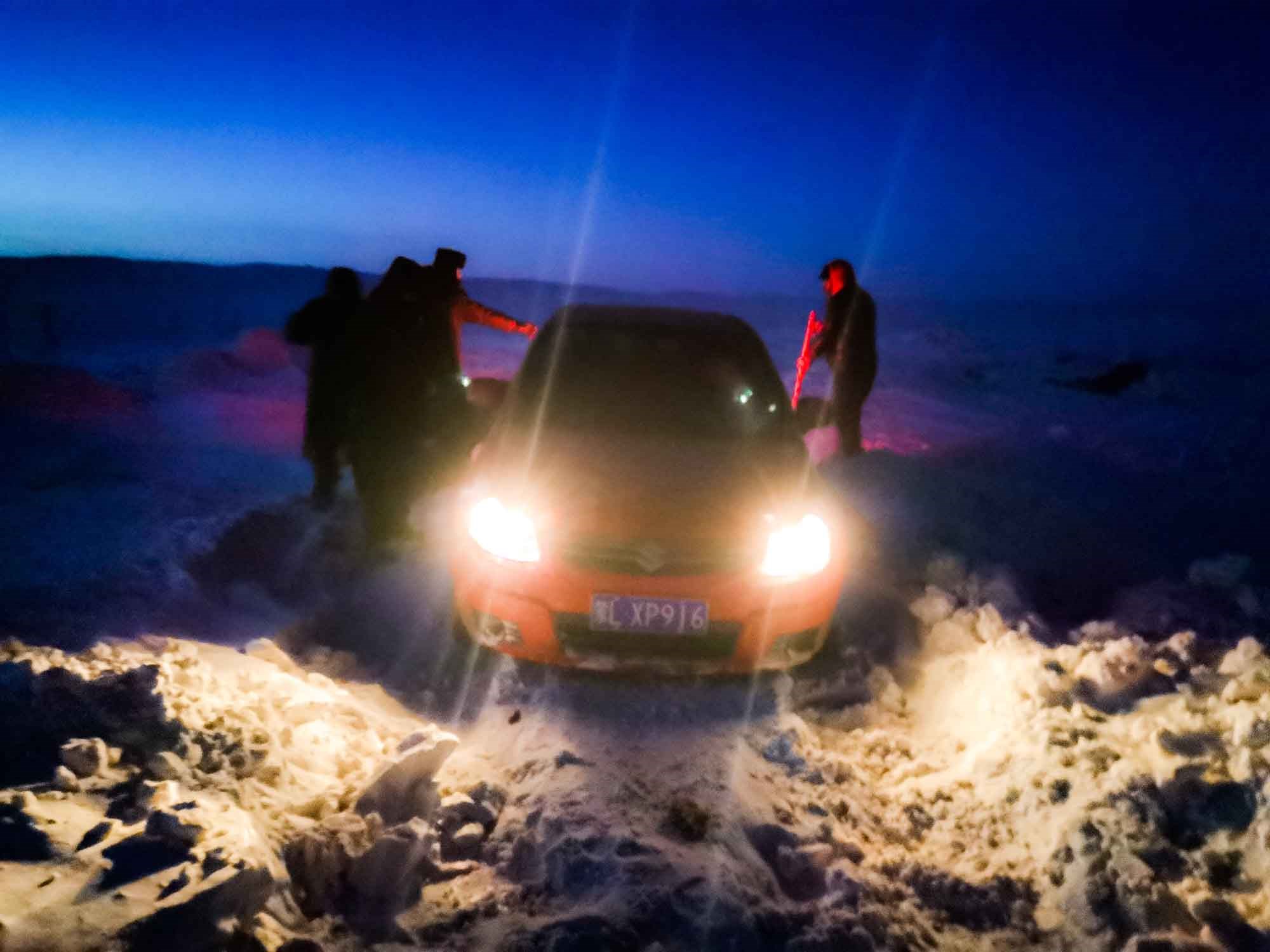 1月17日17時(shí),那木吉拉與弟弟一同駕車(chē)返回百靈廟鎮(zhèn),在途經(jīng)一處被風(fēng)谷地時(shí),由于晚上視線(xiàn)較差,且此處坡度較大,不慎陷入雪中無(wú)法動(dòng)彈,只得撥通電話(huà)請(qǐng)求派出所救助。草原上沒(méi)有遮蔽物,常常到了下午就刮起大風(fēng),吹得積雪覆蓋在土地上分不清地勢(shì)高低,民警們按著平日下鄉(xiāng)走訪(fǎng)的經(jīng)驗(yàn)摸索前進(jìn),經(jīng)過(guò)近一小時(shí)才到達(dá)現(xiàn)場(chǎng),了解情況后,民警們將準(zhǔn)備好的熱水和棉大衣遞給牧民便展開(kāi)了救援工作。在零下35度的冬夜里,民警們用鐵鍬和雙手經(jīng)過(guò)近兩個(gè)小時(shí)的奮戰(zhàn)終于將40厘米厚的積雪清理干凈,并將被困車(chē)輛通過(guò)前拉后推的方式移至平坦區(qū)域。
