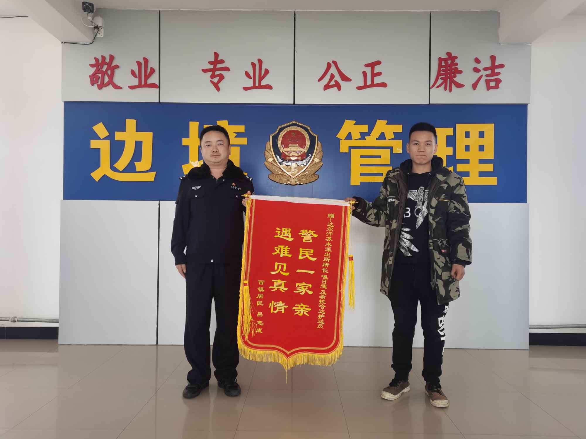 “民警同志太感謝你們了,有你們?cè)谖覀兙透杏X(jué)安心多了。”1月19日早晨,內(nèi)蒙古包頭市達(dá)茂旗達(dá)爾罕蘇木牧民那木吉拉“嘎吱嘎吱”的踩著潔白的積雪走進(jìn)包頭邊境管理支隊(duì)達(dá)爾罕邊境派出所,一邊說(shuō)著一邊拿出印有“警民一家親,遇難見(jiàn)真情”的錦旗遞給民警。