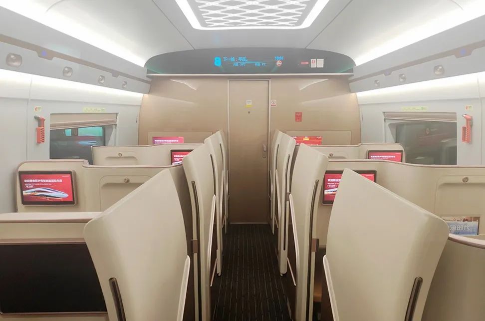 在空間布局方面,CR400BF-GS型動車組通過設(shè)備小型化、集成化的措施,對車廂內(nèi)的整體平面布局進(jìn)行了優(yōu)化。車端占用空間得以縮小,客室空間相應(yīng)增大,列車定員由576人增至619人,顯著提高了動車組列車的載客能力。