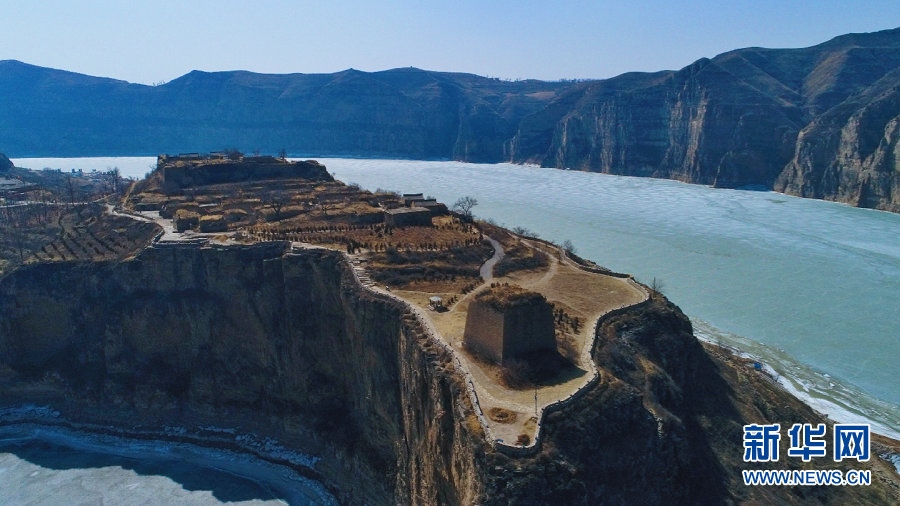 俯瞰老牛灣岸上的古村落與長城烽火臺。新華網(wǎng)發(fā)(樂炎攝)