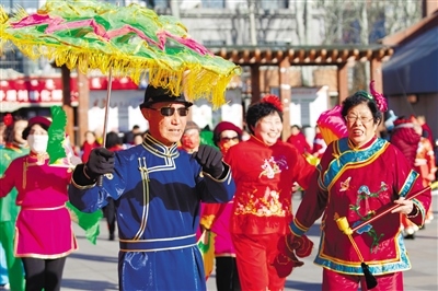 2月8日,在呼和浩特市金地廣場(chǎng),由社區(qū)居民組成的秧歌隊(duì)正在演出。當(dāng)日,呼和浩特市人民路街道辦事處舉辦新春文藝匯演活動(dòng),共有18支志愿隊(duì)伍、260余人參加,極大豐富了社區(qū)居民文化生活。(記者  懷特烏勒斯  攝)