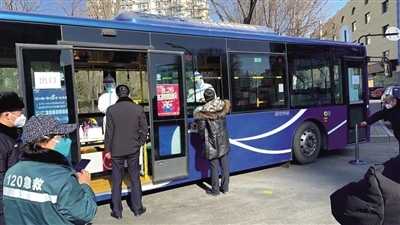 2月28日上午,在呼和浩特市新華大街附近,一輛敞開(kāi)了玻璃窗的公交車??吭诘缆放?,居民們按照規(guī)定間隔排隊(duì),依次來(lái)到公交車前進(jìn)行核酸采樣,醫(yī)務(wù)人員坐在車廂座椅有序地為市民進(jìn)行核酸采樣,受檢人員不用上車,站在窗外,采完即走。