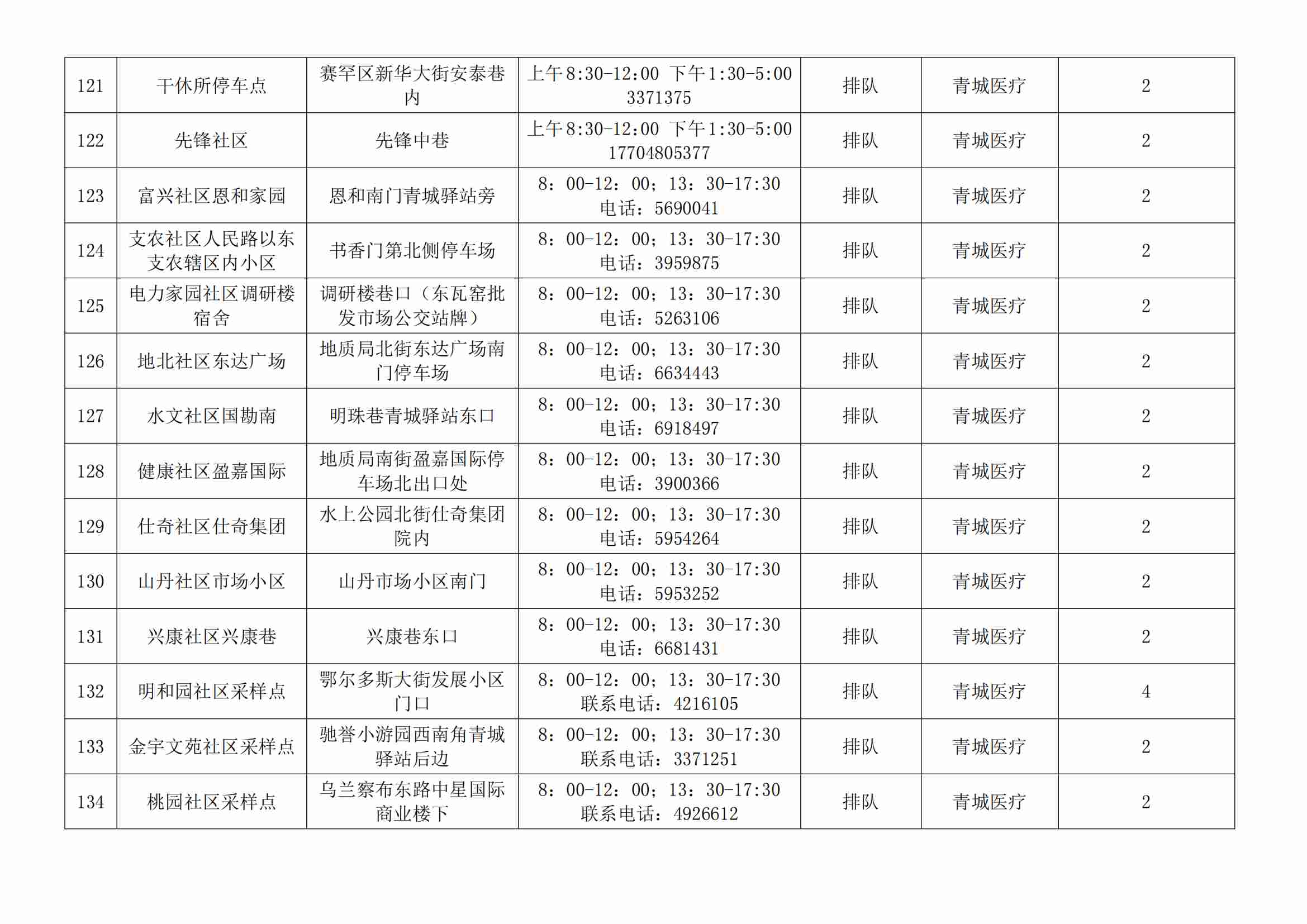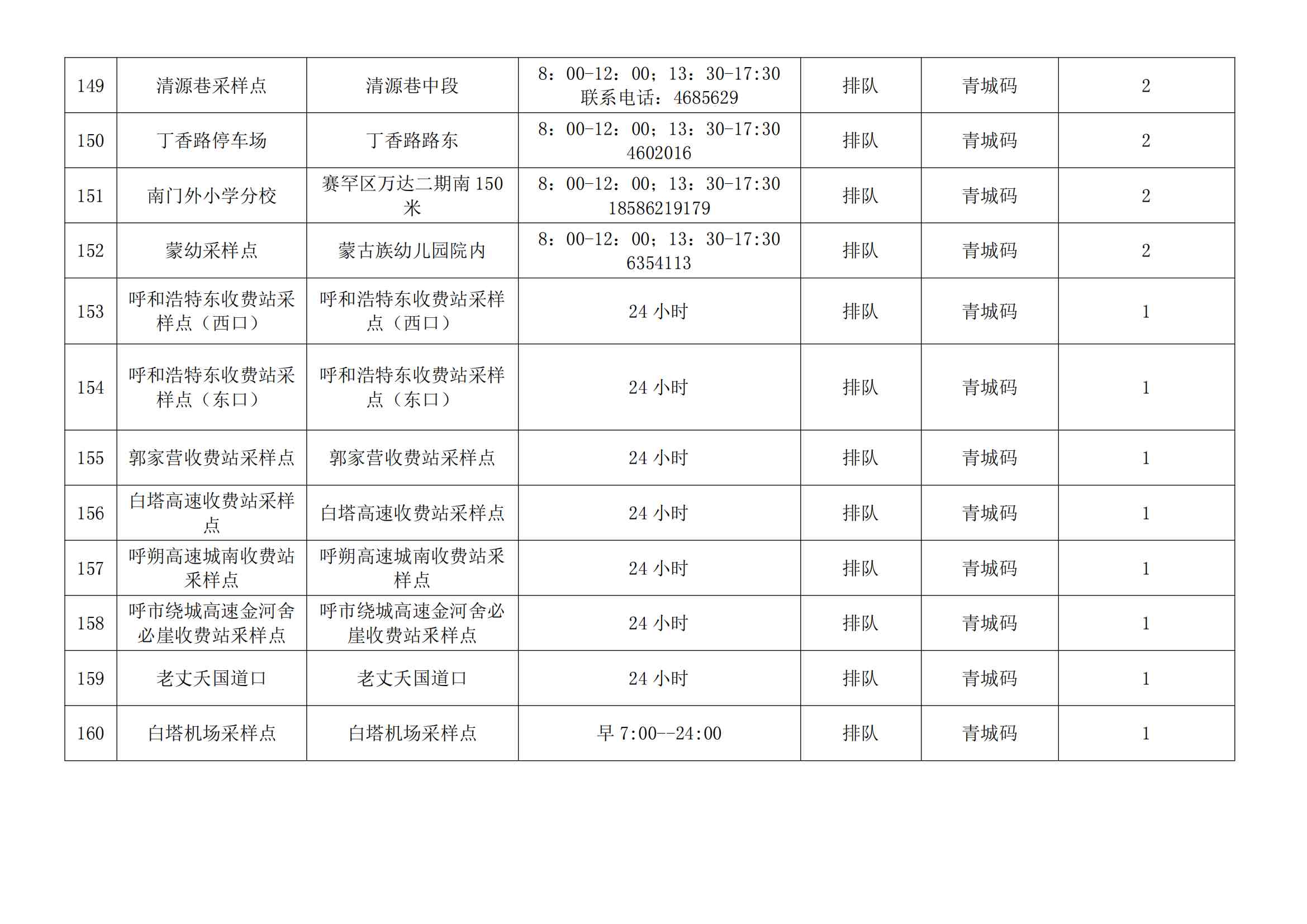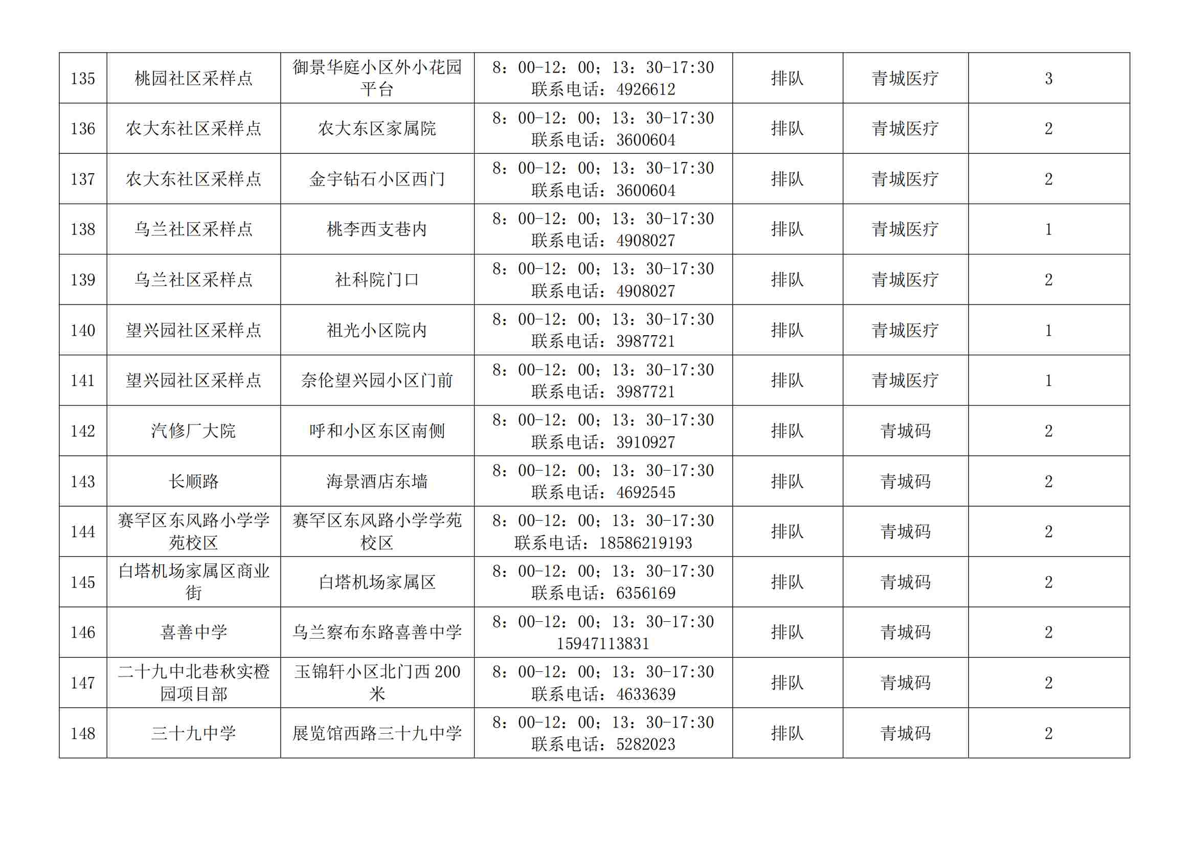根據(jù)全市核酸檢測(cè)政策的調(diào)整,為滿足市民就醫(yī)、出行、工作等核酸檢測(cè)需求,賽罕區(qū)開放160個(gè)便民核酸采樣點(diǎn)(詳見附表),廣大市民可就近選擇,核酸結(jié)果從青城碼查詢。