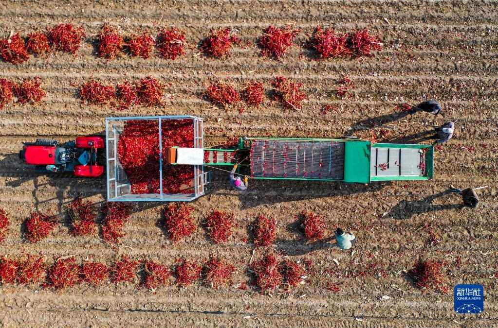 10月25日,在開魯縣東風(fēng)鎮(zhèn),工作人員駕駛鏟車收獲晾曬好的紅干椒(無人機照片)。新華社記者 連振 攝