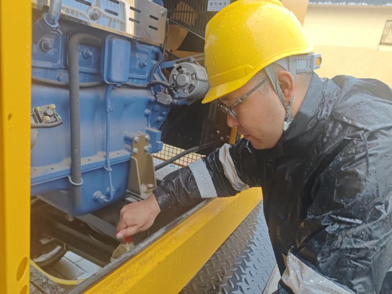 新城變電工區(qū)創(chuàng)業(yè)66千伏變電站運(yùn)維人員啟動(dòng)抽水車(chē)直流電源排出積水。(攝影:王磊)