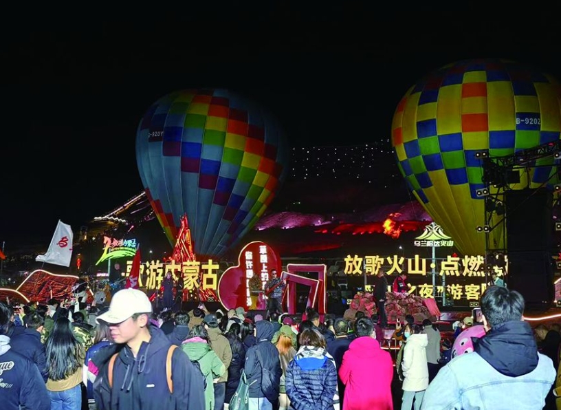 夜幕降臨,3號(hào)火山下的“歌游內(nèi)蒙古?游客嗨歌季”活動(dòng)將氛圍推向高潮。星空下,馬頭琴與電子樂(lè)跨界融合,激昂旋律在火山群間回蕩。游客圍繞篝火載歌載舞?;顒?dòng)最后,盛大的煙花秀劃破夜空,為一天的游玩畫(huà)上句號(hào)。來(lái)自北京的游客劉易表示:“這是我第一次來(lái)烏蘭哈達(dá)火山,這里景致壯觀,文化活動(dòng)豐富,服務(wù)貼心,讓我感受到獨(dú)特的草原魅力?!?/p>