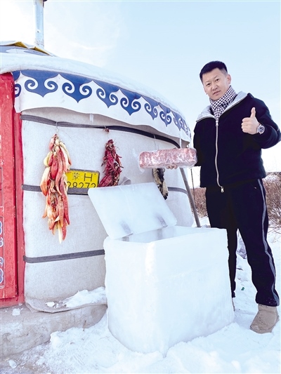 12月8日,記者幾經(jīng)周折與視頻中的小伙張智磊取得了聯(lián)系。張智磊今年36歲,從小在錫林郭勒大草原長大,在當(dāng)?shù)刂饕雠Q蛉馍?。?duì)于意外走紅,張智磊直言自己也沒有想到?!耙曨l是在錫林浩特市南郊向陽村叔叔家院子里的蒙古包拍攝的。記得小時(shí)候,每到冬天,周邊牧民都是把食物埋在雪地里儲(chǔ)存。我前幾天也拍了一個(gè)從雪地里找羊腿的視頻,有粉絲留言‘放在雪地里會(huì)不會(huì)忘記位置容易丟了’,然后我就突發(fā)奇想,干脆做個(gè)‘冰箱’把年貨放進(jìn)去。”張智磊告訴記者,他從12月3日開始凍冰塊,12月4日把凍結(jié)實(shí)的冰塊拿出來用冷水黏合,因?yàn)楸鶋K低于0攝氏度,遇水就會(huì)瞬間黏在一起,然后開始著手打磨,棱棱角角都用電熨斗熨平整,再加上蓋,一個(gè)“冰箱”就完成了。