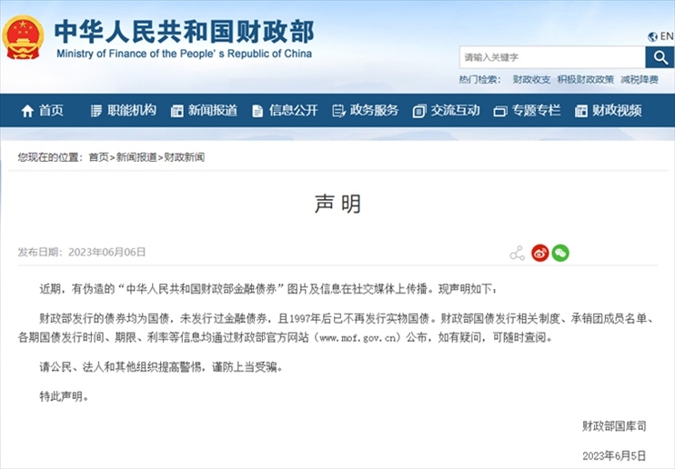 ·財(cái)政部發(fā)布聲明:發(fā)行的債券均為國債,未發(fā)行過金融債券。