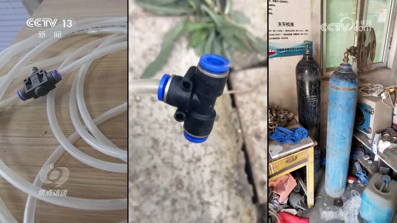 塑料軟管、三通管件、氮?dú)馄?,就是“環(huán)??萍脊尽钡娜藖?lái)給磚廠安裝的所謂“環(huán)保設(shè)備”,他們把氮?dú)饨尤氩蓸庸芫€,稀釋采樣氣體,從而達(dá)到干擾在線監(jiān)測(cè)數(shù)據(jù)的目的。