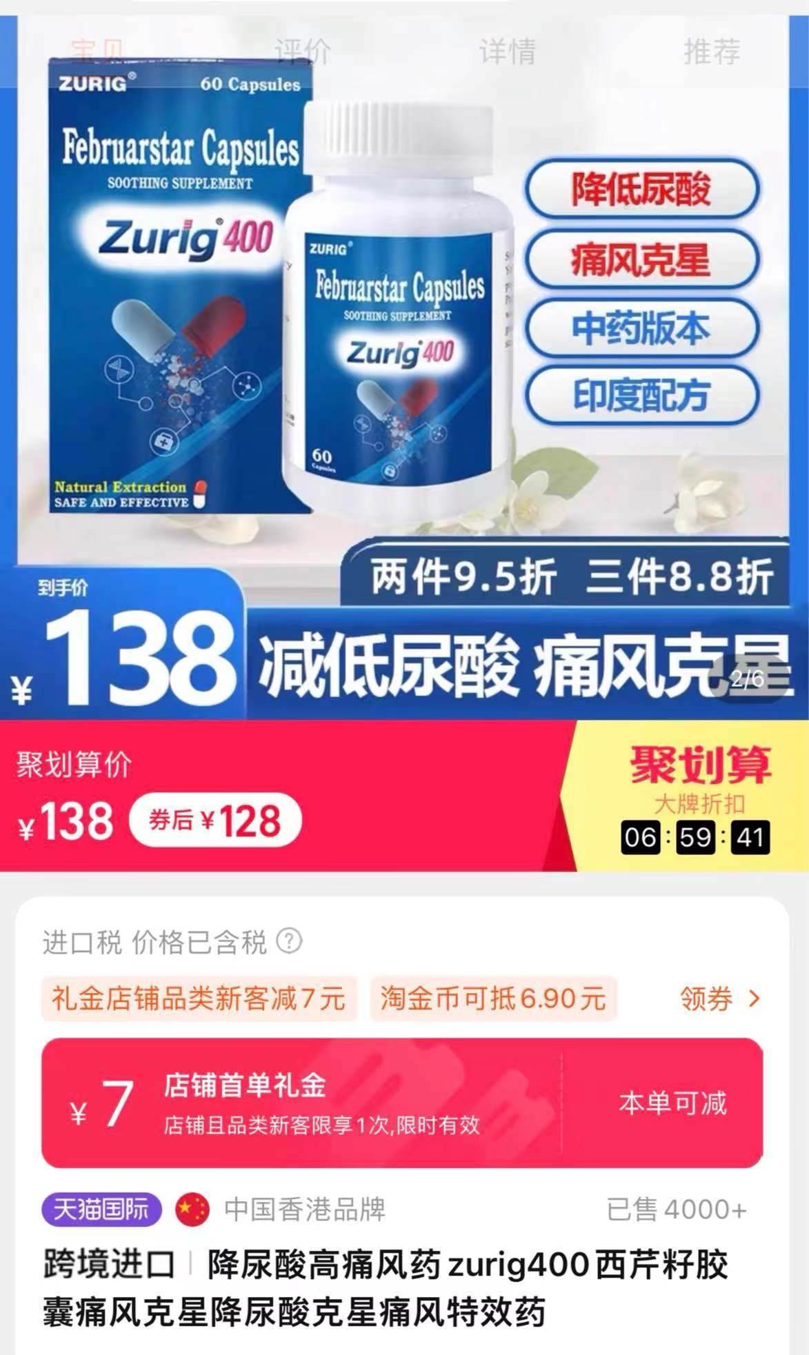 此外,zurig400在銷售頁面還模仿印度zurig80,宣稱降尿酸、痛風藥。澎湃新聞記者調查發(fā)現(xiàn),zurig400目前在多個網購平臺有售,有商家顯示已出售4000+。 經了解后得知,印度zurig80實際上是一款仿制藥,目前國內并未獲批上市;而zurig400卻是一款香港產的保健品類目產品,并非藥品。但產品宣傳時卻使用“痛風特效藥”“印度配方”“中藥非布”等詞語,讓患者產生誤會。