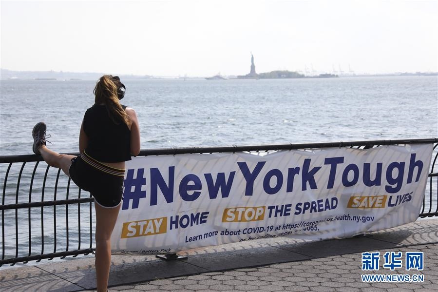 6月10日,一名女子在美國紐約一處公園內(nèi)寫有“紐約堅(jiān)強(qiáng)”的橫幅旁鍛煉。新華社記者王迎攝