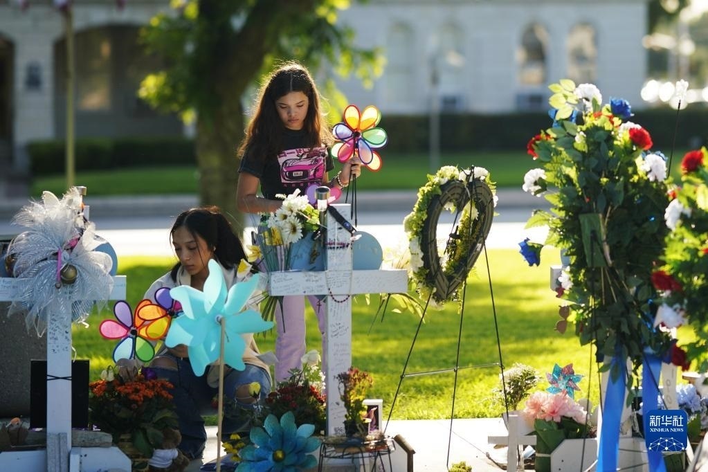 5月24日,美國(guó)得克薩斯州小城尤瓦爾迪的原羅布小學(xué)擺放著校園槍擊遇害者的照片。