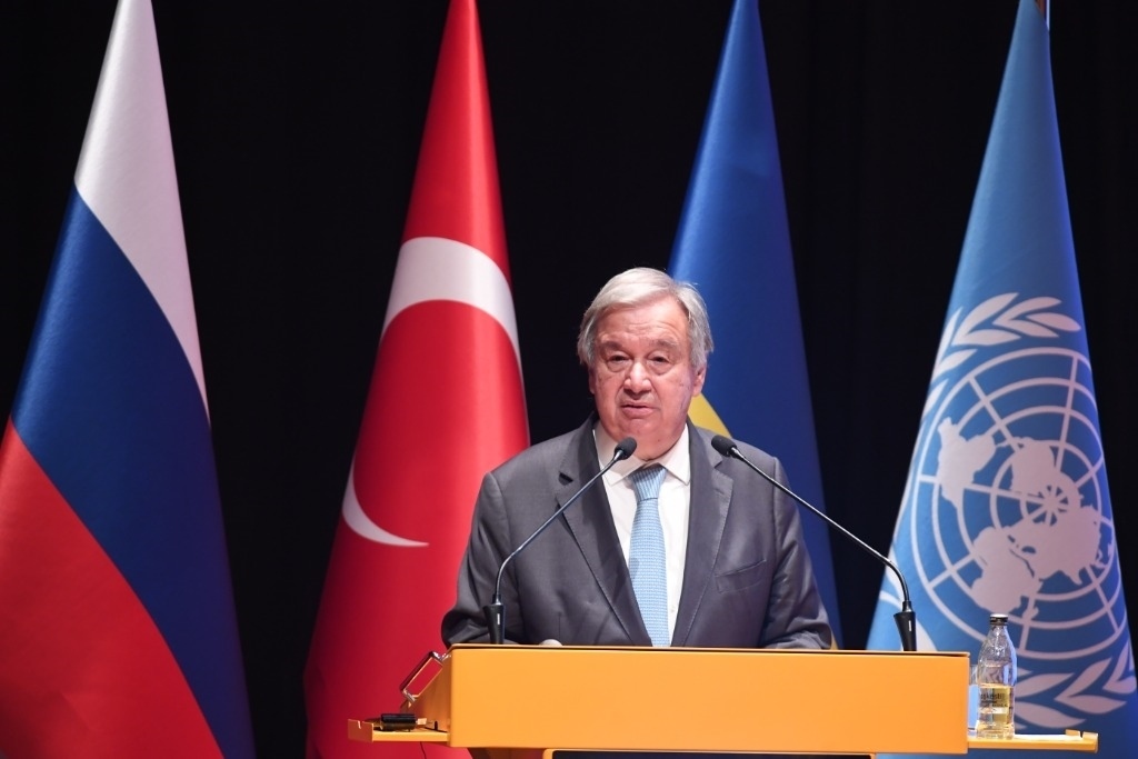 2022年8月20日,在位于土耳其伊斯坦布爾的土耳其國(guó)防大學(xué)內(nèi)的黑海糧食外運(yùn)聯(lián)合協(xié)調(diào)中心,聯(lián)合國(guó)秘書(shū)長(zhǎng)古特雷斯出席新聞發(fā)布會(huì)。新華社記者沙達(dá)提攝