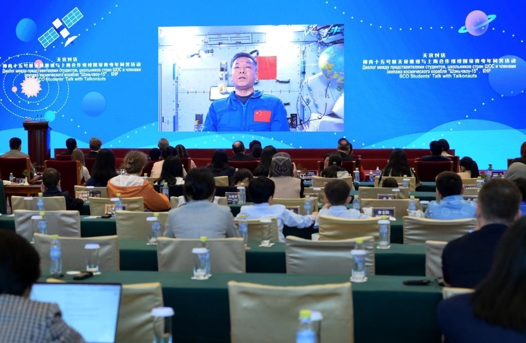4月20日,神舟十五號(hào)航天員通過視頻屏幕回答上海合作組織國(guó)家青少年的提問。新華社記者 李賀 攝