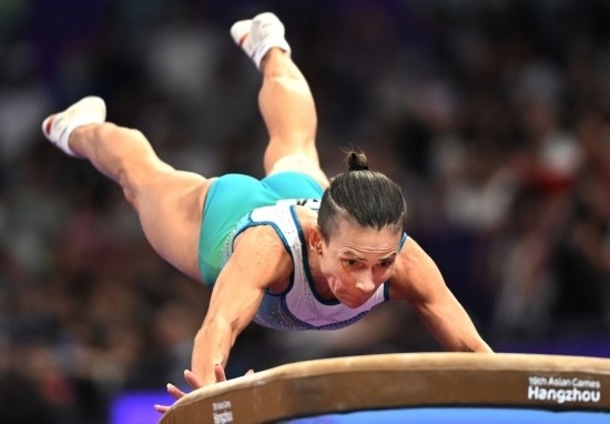 9月28日,烏茲別克斯坦選手奧克薩娜·丘索維金娜在杭州亞運(yùn)會競技體操項目女子跳馬決賽中,最終她獲得第四名。新華社記者 程敏 攝