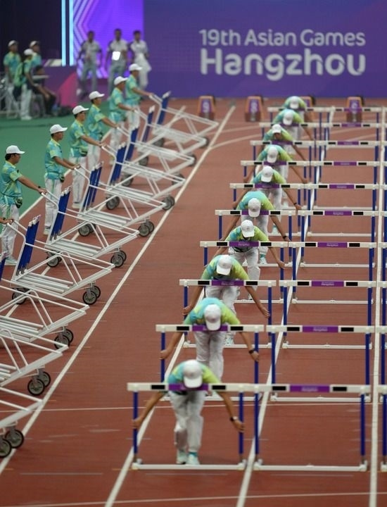 9月30日,杭州亞運(yùn)會志愿者在田徑項目女子七項全能100米欄比賽前進(jìn)行場地準(zhǔn)備工作。新華社記者 江文耀 攝