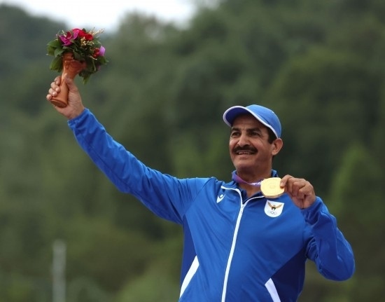 9月27日,金牌得主科威特選手阿卜杜拉·拉希迪在杭州亞運(yùn)會射擊項目男子雙向飛碟個人賽頒獎儀式上。新華社記者 杜瀟逸 攝