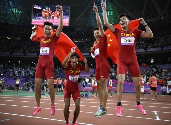 10月3日,中國選手陳冠鋒、謝震業(yè)、陳佳鵬、嚴(yán)海濱(從右至左)慶祝奪得杭州亞運(yùn)會田徑項目男子4x100米接力冠軍。新華社記者 宋彥樺 攝