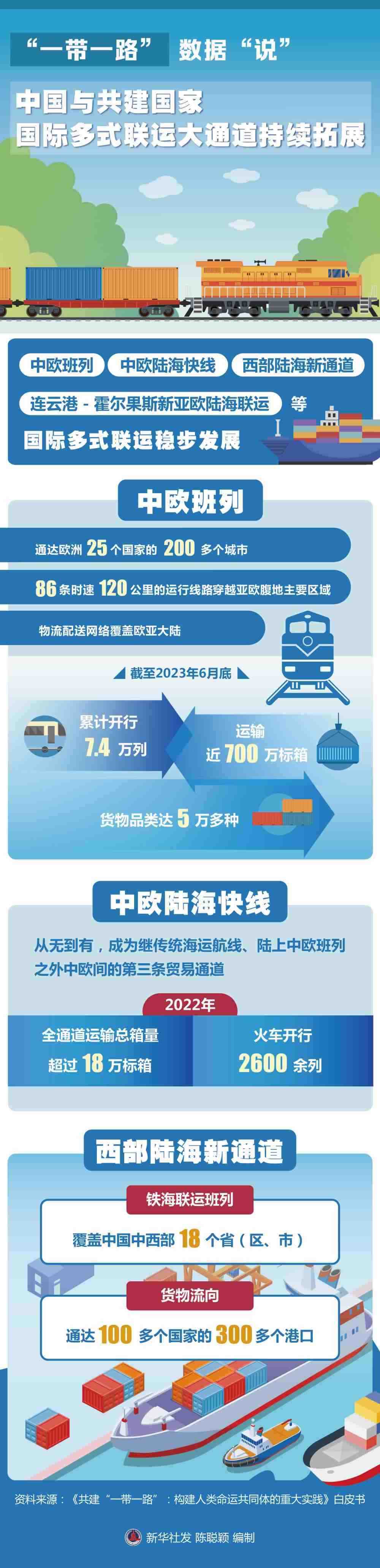 國(guó)際多式聯(lián)運(yùn)大通道持續(xù)拓展。中歐班列、中歐陸??炀€、西部陸海新通道、連云港-霍爾果斯新亞歐陸海聯(lián)運(yùn)等國(guó)際多式聯(lián)運(yùn)穩(wěn)步發(fā)展。中歐班列通達(dá)歐洲25個(gè)國(guó)家的200多個(gè)城市,86條時(shí)速120公里的運(yùn)行線路穿越亞歐腹地主要區(qū)域,物流配送網(wǎng)絡(luò)覆蓋歐亞大陸;截至2023年6月底,中歐班列累計(jì)開(kāi)行7.4萬(wàn)列,運(yùn)輸近700萬(wàn)標(biāo)箱,貨物品類達(dá)5萬(wàn)多種,涉及汽車整車、機(jī)械設(shè)備、電子產(chǎn)品等53大門類,合計(jì)貨值超3000億美元。中歐陸??炀€從無(wú)到有,成為繼傳統(tǒng)海運(yùn)航線、陸上中歐班列之外中歐間的第三條貿(mào)易通道,2022年全通道運(yùn)輸總箱量超過(guò)18萬(wàn)標(biāo)箱,火車開(kāi)行2600余列。西部陸海新通道鐵海聯(lián)運(yùn)班列覆蓋中國(guó)中西部18個(gè)?。▍^(qū)、市),貨物流向通達(dá)100多個(gè)國(guó)家的300多個(gè)港口。