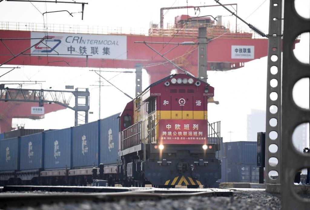 ?3月7日,中歐班列(越南·河內(nèi)——中國(guó)·西安——匈牙利·布達(dá)佩斯)跨境公鐵聯(lián)運(yùn)班列從西安國(guó)際港站駛出。新華社記者李一博攝