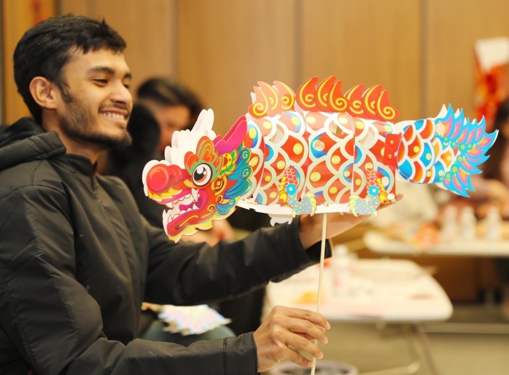 ?2月23日,在山東自貿(mào)試驗(yàn)區(qū)青島片區(qū),外國(guó)留學(xué)生拼裝龍形花燈。新華社發(fā)(張進(jìn)剛攝)