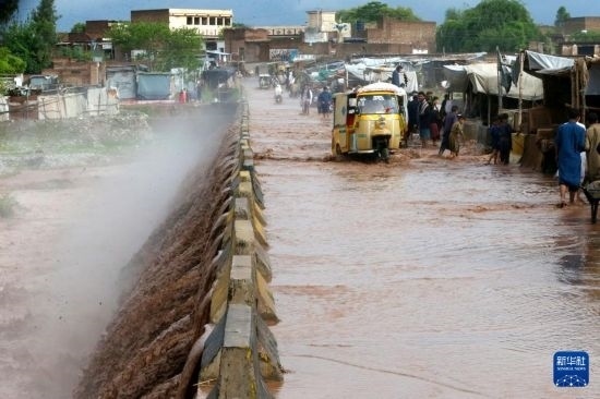4月15日,在巴基斯坦西北部城市白沙瓦,車輛涉水前進(jìn)。新華社發(fā)(奧馬爾·卡尤姆攝)