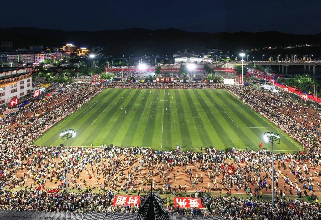 ?2023年7月1日,人們?cè)谟^看貴州“村超”足球賽(無(wú)人機(jī)照片)。新華社記者楊文斌攝
