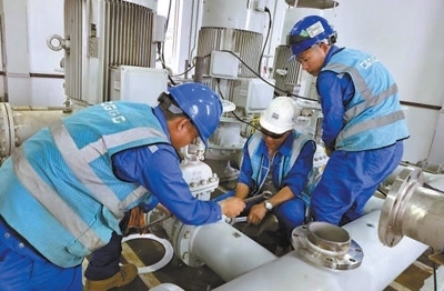 工作人員正在對(duì)阿聯(lián)酋烏姆蓋萬海水淡化設(shè)備管道系統(tǒng)進(jìn)行維護(hù)。盧偉寧攝