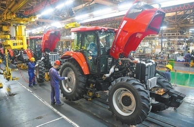 2024年5月,在位于河南洛陽市的中國一拖大拖公司總裝生產(chǎn)線上,工人正在裝配拖拉機(jī)。張怡熙攝(影像中國)