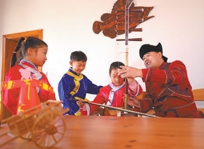 哈拉新村村民在教當(dāng)?shù)睾⒆友葑鄠鹘y(tǒng)樂(lè)器。齊齊哈爾大學(xué)孟加拉國(guó)籍留學(xué)生 衣睿實(shí)攝“在哈拉新村,我看到四弦琴造型的村口大門、魚叉狀的路燈,還有整整齊齊的‘介字房’……這里獨(dú)特的民族文化、濃郁的鄉(xiāng)土風(fēng)情,給我留下了深刻印象。當(dāng)?shù)丶缺A魝鹘y(tǒng)的達(dá)斡爾族人文特征,又開發(fā)文化體驗(yàn)館、民族特色美食等現(xiàn)代旅游資源,重視文化保護(hù)和傳承的做法值得借鑒?!?/p>
