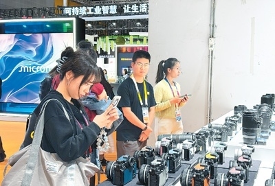 觀眾在進(jìn)博會尼康相機展臺參觀。本報記者 高 喬攝
