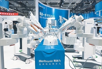 在進(jìn)博會醫(yī)療器械及醫(yī)藥保健館,美敦力展示的Hugo RAS機器人輔助手術(shù)系統(tǒng)。本報記者 高 喬攝