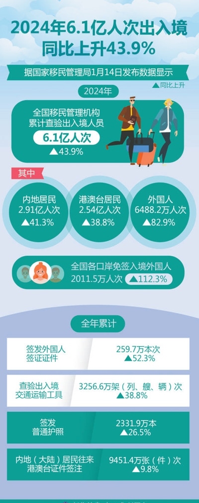在2024年中國國際傳播年度熱詞榜上,“中國游”一詞名列前十。中國全面放寬優(yōu)化免簽政策,推出一系列便利外國人來華政策舉措,“中國游”成為越來越多外國游客的優(yōu)先選擇。中國國家移民管理局最新數(shù)據(jù)顯示,2024年,全國移民管理機構累計查驗出入境人員6.1億人次,同比上升43.9%;其中內(nèi)地居民2.91億人次、港澳臺居民2.54億人次、外國人6488.2萬人次,同比分別上升41.3%、38.8%、82.9%。全國各口岸免簽入境外國人2011.5萬人次,同比上升112.3%。說走就走的“中國游”打開了世界了解中國的新窗口、新通道,向全球展現(xiàn)真實、多元和活力滿滿的中國形象。