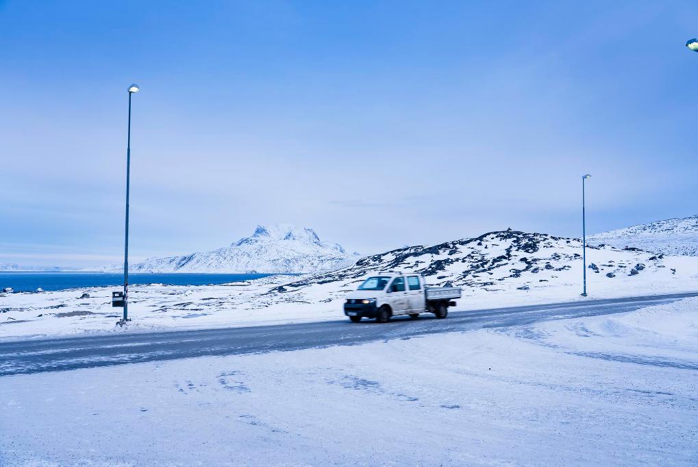 1月16日,一輛汽車行駛在丹麥自治領地格陵蘭島首府努克市郊。新華社發(fā)(安德斯·孔斯豪格攝)