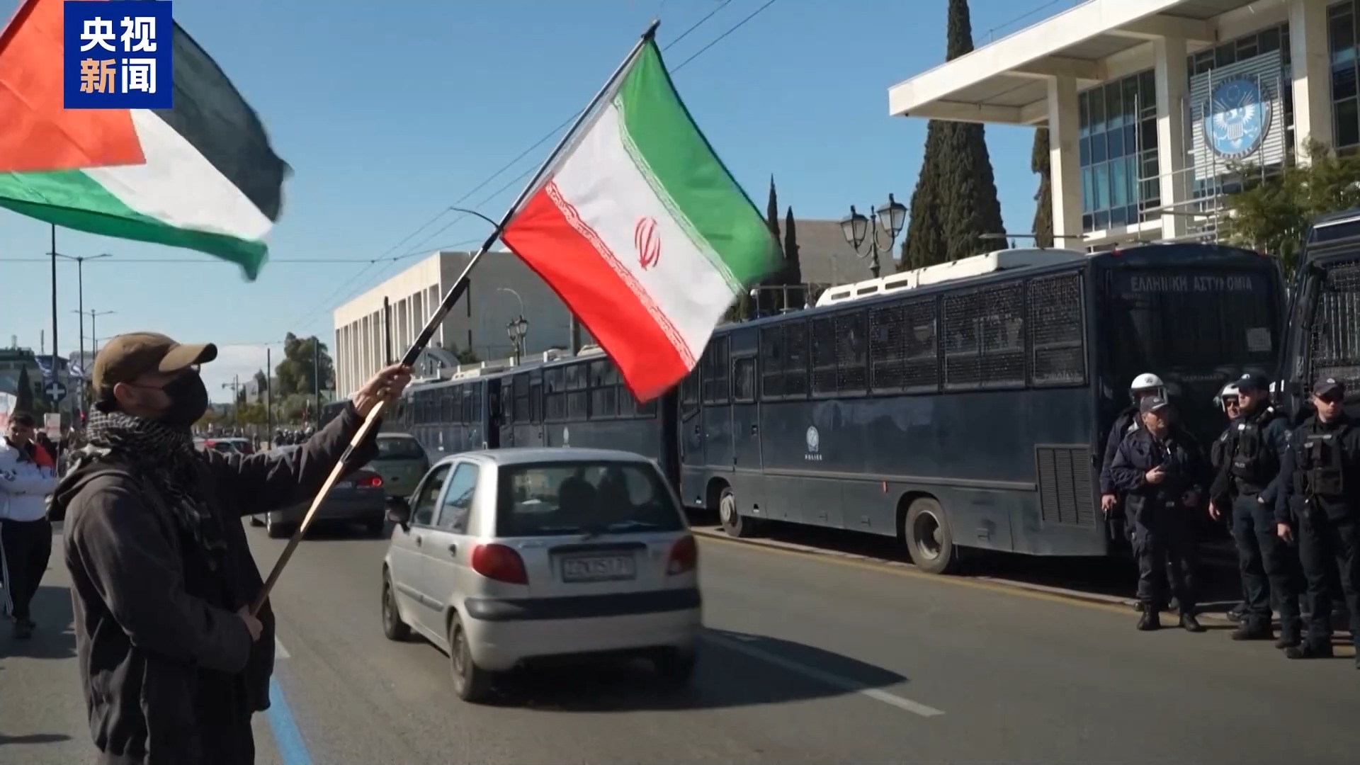 在希臘雅典的美國和以色列大使館前,逾千名示威者手持伊朗國旗或標(biāo)語牌、高喊口號(hào)參與游行示威活動(dòng),抗議美以對(duì)伊朗發(fā)動(dòng)襲擊。為維護(hù)現(xiàn)場秩序,當(dāng)?shù)爻鰟?dòng)大量警力并在美國和以色列大使館前使用一排警用大巴封鎖隔離。