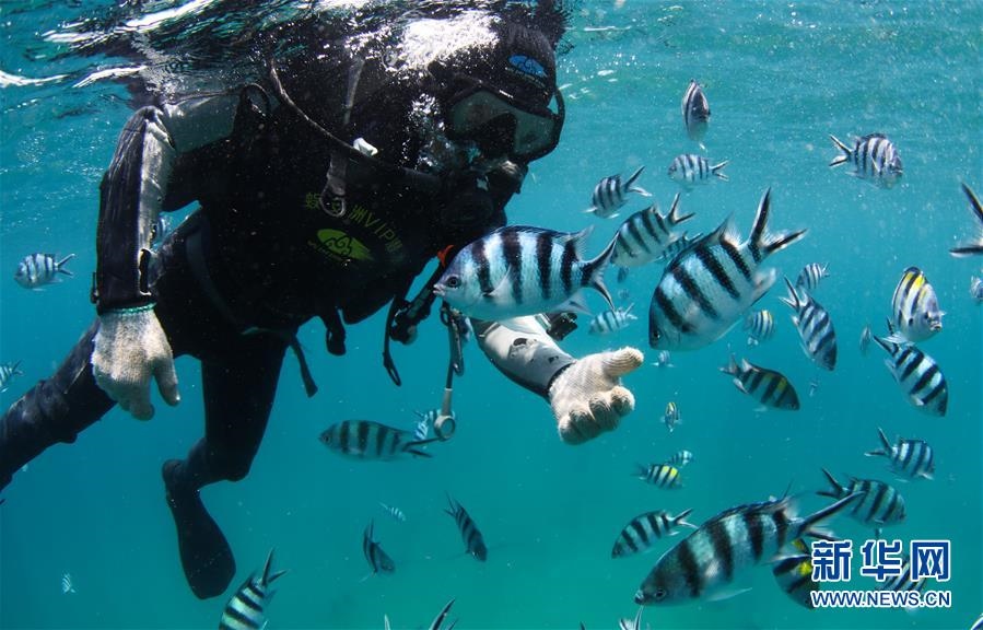 在海南三亞蜈支洲島海域拍攝的與??采男〕篝~(yú)(5月28日攝)。海南省三亞蜈支洲島海域海洋牧場(chǎng)是海南首個(gè)國(guó)家級(jí)海洋牧場(chǎng)示范區(qū),也是中國(guó)第一個(gè)位于熱帶地區(qū)的海洋牧場(chǎng)。近年來(lái),蜈支洲島海域海洋牧場(chǎng)推進(jìn)海洋生態(tài)系統(tǒng)的恢復(fù)和保護(hù),先后開(kāi)展了人工魚(yú)礁投放、海洋環(huán)境修復(fù)、珊瑚移植等工作。截至2019年底,蜈支洲島海域海洋牧場(chǎng)共投放各類(lèi)人工魚(yú)礁1526塊、船礁21艘和一批火山石礁,共達(dá)4萬(wàn)空立方米,礁區(qū)海域的漁業(yè)資源比非礁區(qū)要高5倍以上。目前,蜈支洲島海域海洋牧場(chǎng)已初現(xiàn)雛形。新華社記者楊冠宇攝