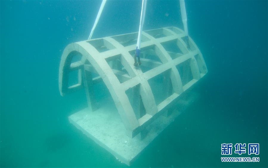 在海南三亞蜈支洲島海域,旅游區(qū)工作人員將船型屋魚(yú)礁吊裝入海(2016年1月21日攝)。新華社發(fā)