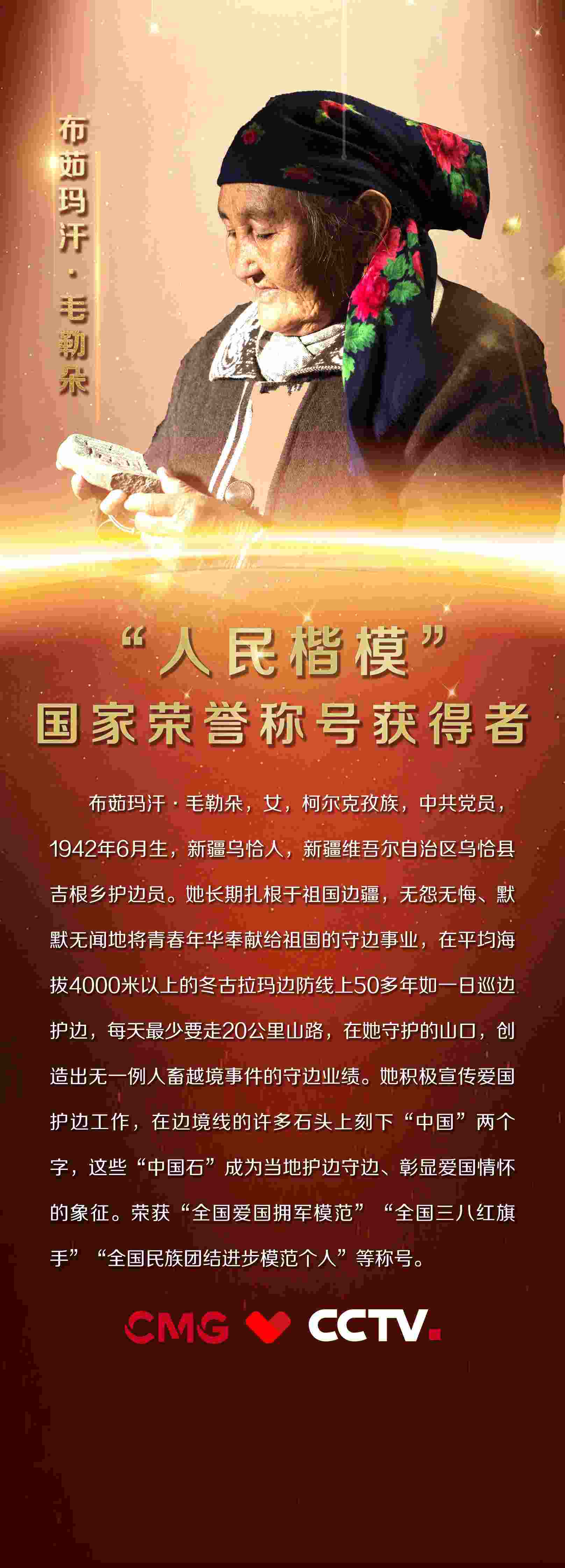 布茹瑪汗·毛勒朵,女,柯爾克孜族,中共黨員,1942年6月生,新疆烏恰人,新疆維吾爾自治區(qū)烏恰縣吉根鄉(xiāng)護(hù)邊員。她長期扎根于祖國邊疆,無怨無悔、默默無聞地將青春年華奉獻(xiàn)給祖國的守邊事業(yè),在平均海拔4000米以上的冬古拉瑪邊防線上50多年如一日巡邊護(hù)邊,每天最少要走20公里山路,在她守護(hù)的山口,創(chuàng)造出無一例人畜越境事件的守邊業(yè)績。她積極宣傳愛國護(hù)邊工作,在邊境線的許多石頭上刻下“中國”兩個(gè)字,這些“中國石”成為當(dāng)?shù)刈o(hù)邊守邊、彰顯愛國情懷的象征。榮獲“全國愛國擁軍模范”“全國三八紅旗手”“全國民族團(tuán)結(jié)進(jìn)步模范個(gè)人”等稱號。