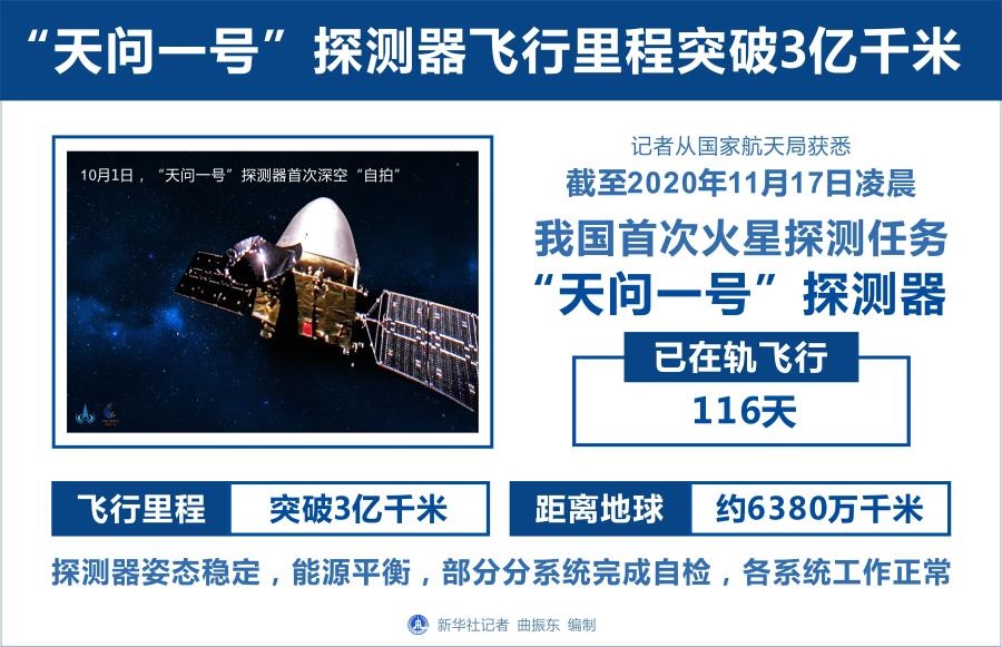 新華社北京11月17日電(記者胡喆)記者從國(guó)家航天局獲悉,截至2020年11月17日凌晨,我國(guó)首次火星探測(cè)任務(wù)“天問(wèn)一號(hào)”探測(cè)器已在軌飛行116天,飛行里程突破3億千米,距離地球約6380萬(wàn)千米。探測(cè)器姿態(tài)穩(wěn)定,能源平衡,部分分系統(tǒng)完成自檢,各系統(tǒng)工作正常。