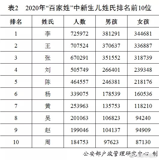 剛剛,公安部戶政管理研究中心二〇二〇年全國姓名報告發(fā)布。按戶籍人口數(shù)量排名,2020年的“百家姓”與2019年相比變化不大。“王”“李”“張”“劉”“陳”依舊名列前五,五大姓氏人口總數(shù)占全國戶籍總?cè)丝诘?0.8%。截止到2020年12月31日,2020年出生并已經(jīng)到公安機(jī)關(guān)進(jìn)行戶籍登記的新生兒共1003.5萬,其中男孩529.0萬,占52.7%,女孩474.5萬,占47.3%。2020年“百家姓”中新生兒登記姓氏最多的是“李”,共72.6萬人。2020年出生并已經(jīng)進(jìn)行戶籍登記的女性新生兒中,使用頻率最高的10個名字依次為:“一諾”“依諾”“欣怡”“梓涵”“語桐”“欣妍”“可欣”“語汐”“雨桐”“夢瑤”。與2019年相比,“一諾”“依諾”“欣怡”依舊位列三甲,“語桐”“可欣”“語汐”“夢瑤”進(jìn)入前十。(記者 熊豐、任沁沁)