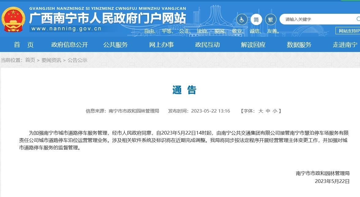 5月22日14時起 南寧公交集團接管慧泊停車運營管理業(yè)務 經(jīng)市人民政府同意,自2023年5月22日14時起,由南寧公共交......
