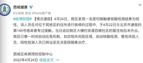 4月24日,我區(qū)(北京市西城區(qū))發(fā)現(xiàn)一名密切接觸者核酸檢測結(jié)果為陽性。該人員在對位于其他區(qū)的住所進行裝修的過程中,于4月22日與北京市通報的第145號感染者有過接觸。當(dāng)日返回我區(qū)大柵欄街道百順社區(qū)的暫住地后未外出。