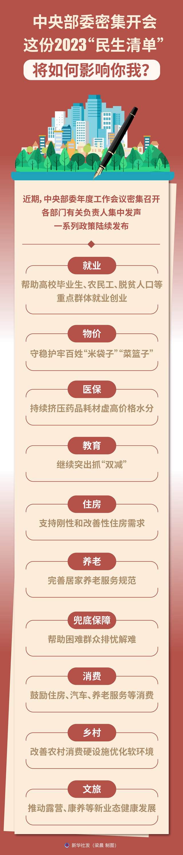 近期,中央部委年度工作會議密集召開,各部門有關(guān)負(fù)責(zé)人集中發(fā)聲,一系列政策陸續(xù)發(fā)布。“新華視點”記者梳理了多個領(lǐng)域2023年聚焦民生關(guān)切的重要舉措。