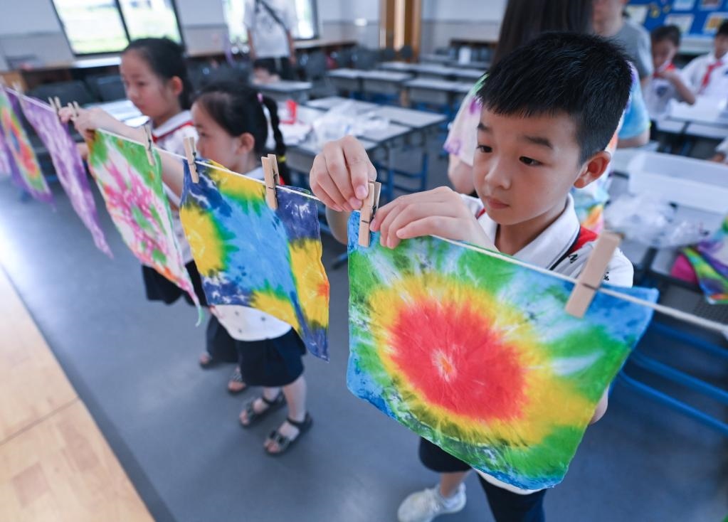 2022年8月10日,湖州市吳興實驗小學(xué)的學(xué)生把做好的扎染作品掛在教室里。新華社記者 徐昱 攝