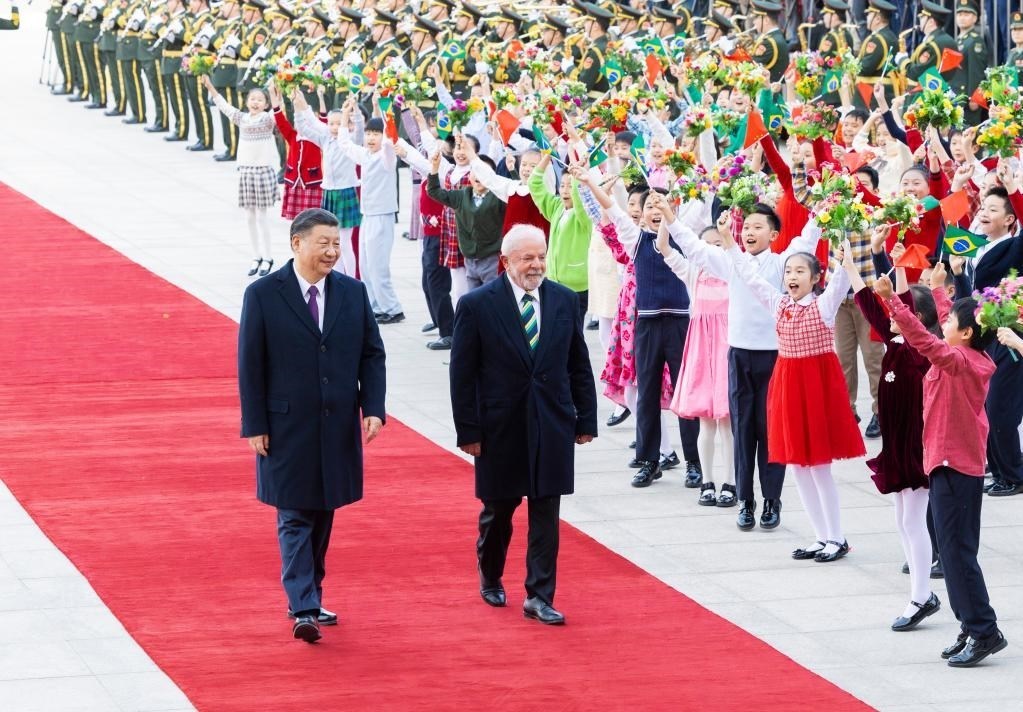 4月14日下午,國家主席習(xí)近平在北京人民大會(huì)堂同來華進(jìn)行國事訪問的巴西總統(tǒng)盧拉舉行會(huì)談。這是會(huì)談前,習(xí)近平在人民大會(huì)堂東門外廣場(chǎng)為盧拉舉行歡迎儀式。新華社記者 黃敬文 攝