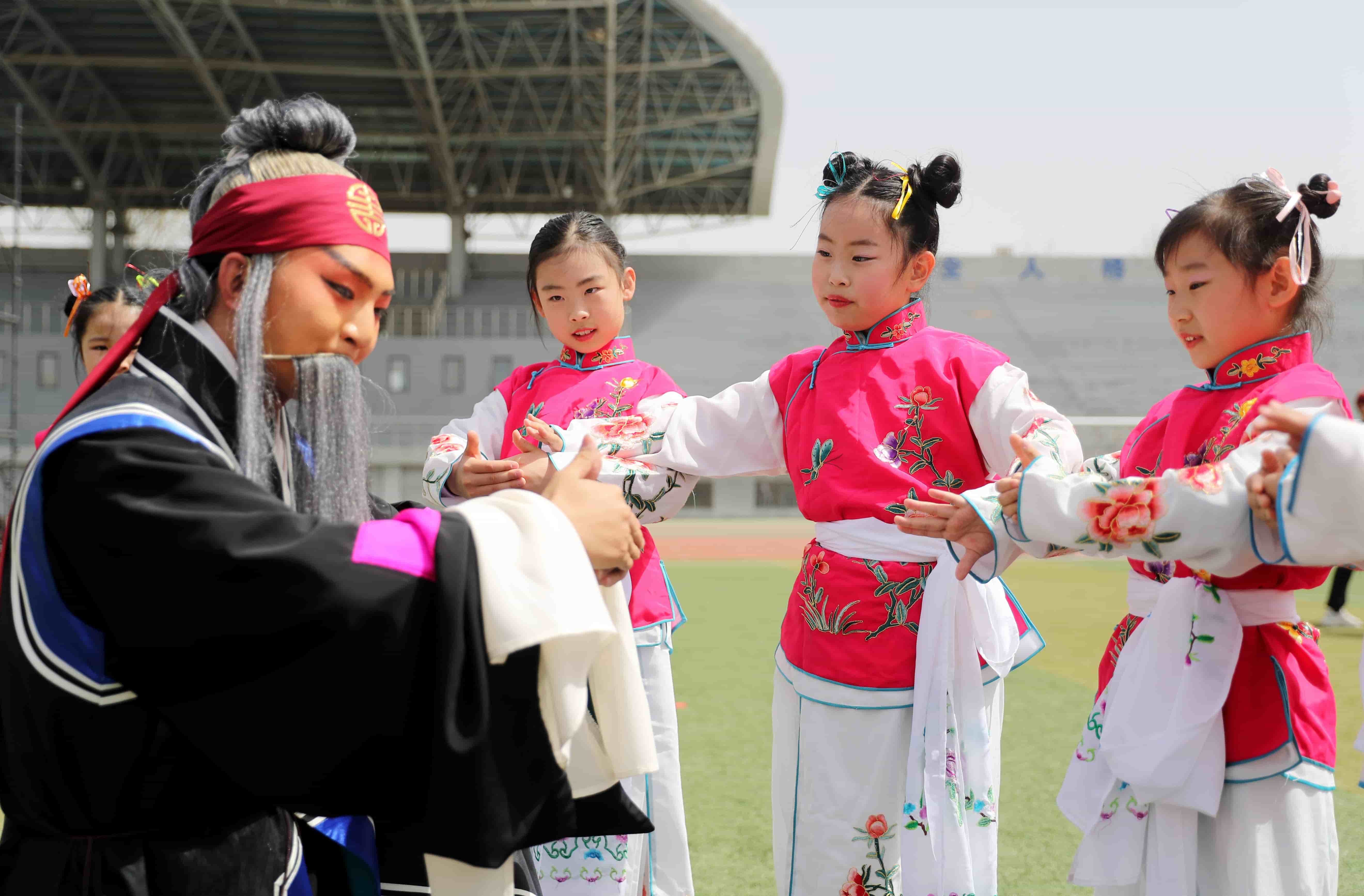 4月15日,山東青島,中國(guó)石油大學(xué)(華東)韻遠(yuǎn)京劇隊(duì)的同學(xué)們聯(lián)合青島西海岸新區(qū)珠江路小學(xué)的小學(xué)生在大學(xué)校園里上演了一堂生動(dòng)的戲曲普及課。 張進(jìn)剛 攝