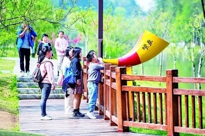 游客在湖南常德桃花源風(fēng)景名勝區(qū)體驗“噴泉”游戲。新華社發(fā)