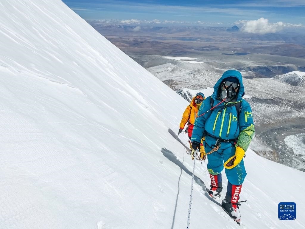 董紅娟(左)在登頂希夏邦馬峰后下撤(4月26日攝)。新華社發(fā)(頓巴 攝)