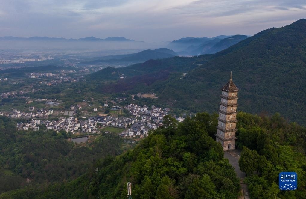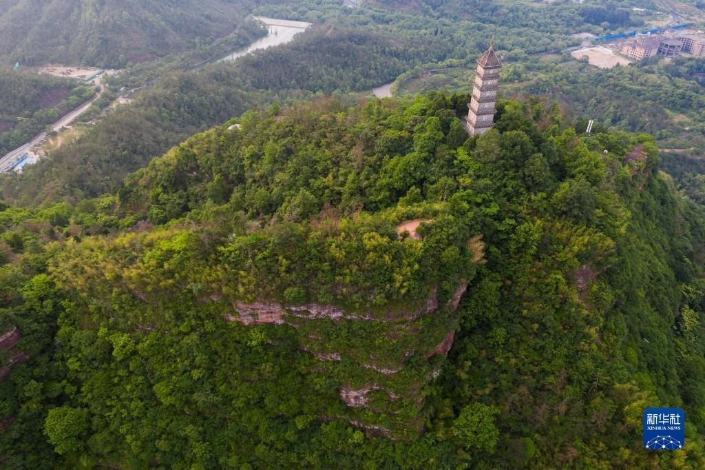 俯瞰天臺縣的赤城山及山頂的梁妃塔(5月16日攝,無人機照片)。