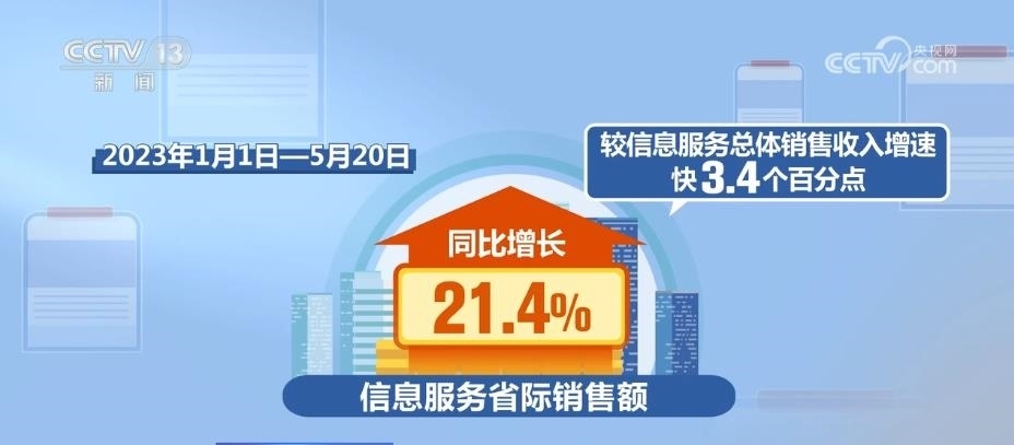 從信息方面來看,2017年—2022年,全國(guó)信息服務(wù)省際銷售額年均增長(zhǎng)22%,較信息服務(wù)總體銷售收入增速快2.8個(gè)百分點(diǎn)。2023年1月1日—5月20日,信息服務(wù)省際銷售額同比增長(zhǎng)21.4%,較信息服務(wù)總體銷售收入增速快3.4個(gè)百分點(diǎn)。